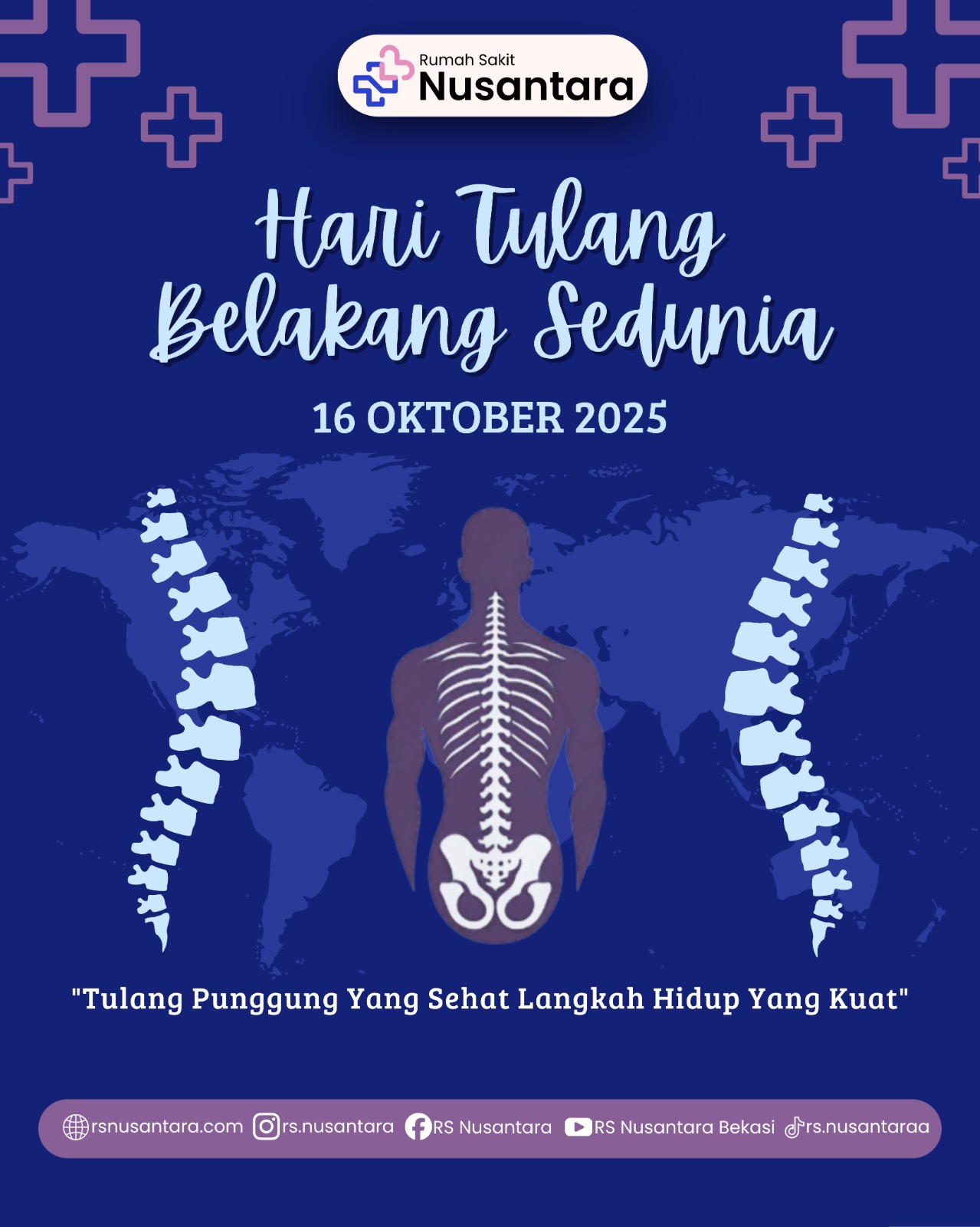 Setiap tanggal 16 Oktober, dunia memperingati Hari Tulang Belakang Sedunia (World Spine Day) sebagai upaya meningkatkan kesadaran global terhadap pentingnya menjaga kesehatan tulang belakang. Tahun 2025 ini, Rumah Sakit Nusantara mengajak masyarakat untuk lebih peduli pada kesehatan tulang belakang melalui tema: